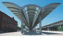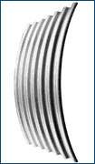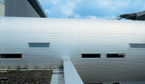 Sonderprofilierte Bleche mit ca. 90 mm Stegen zwischen den Sicken und geraden Ausläufen zur Aus- bildung flacher Überlappungen und robuster Befestigung auf der gebogenen Unterkonstruktion.