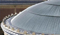 Bombierte (d. h. gegen das Profil gerundete) Wellbleche aus Titanzink, die zusätzlich für die Kuppel- ausbildung noch verjüngt wurden. Es lassen sich eine Reihe von Wellprofilen in Radien bis zu 1000 mm bombieren.